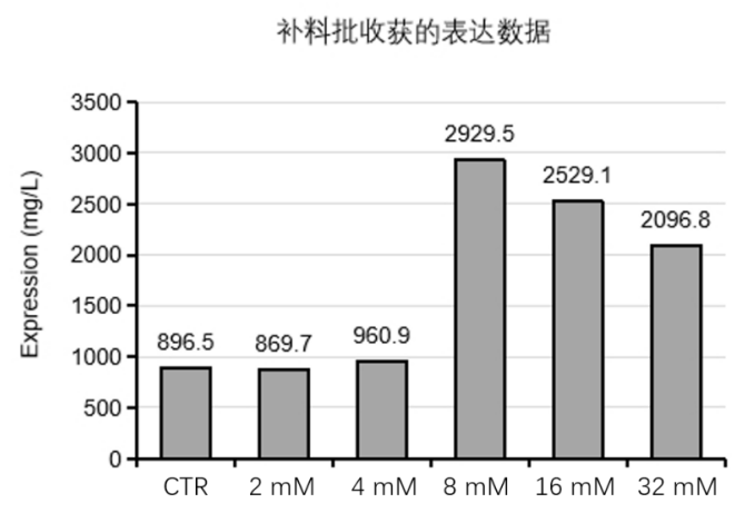 此前,并无高效表达人类神经生长因子(human never growth factor,hNGF)的培养方法,极大限制了 hNGF 的大规模生产和在临床与药物方面的应用。汉腾生物采用补料分批培养方法,并发现了新的添加剂,可以将 hNGF 重组蛋白的表达量提高至少 100%,产量最高可提升至 2900 mg/L左右(图 2),较大地提升了 hNGF 在 CHO 细胞中的表达水平(详细内容参考汉腾专利:重组神经生长因子的高效表达方法,CN2023108028220)
