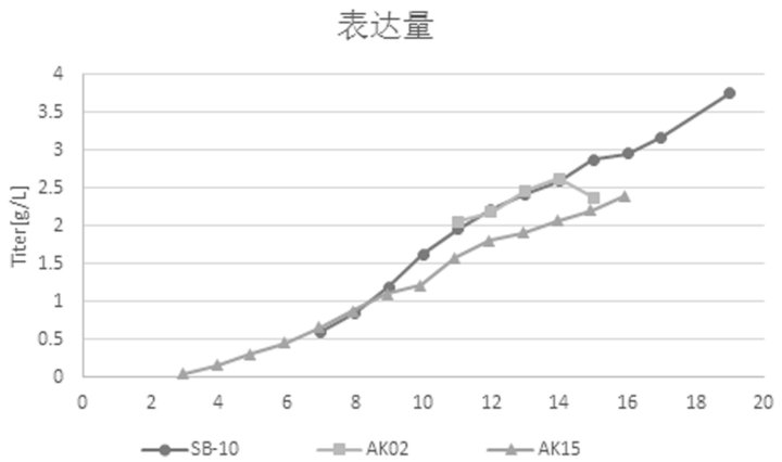 图 4. 蛋白表达量。SB-10:环轨摇晃式生物反应器;AK02:3 L搅拌式生物反应器;AK15:15 L搅拌式生物反应器